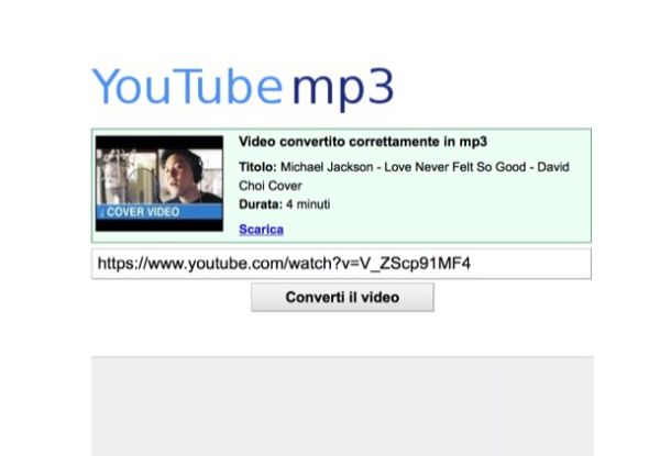 Se cerchi una soluzione ancora più essenziale, puoi affidarti a YouTubeMP3 che permette di convertire i video di YouTube in MP3 in un paio di click. Per provarlo, collegati subito alla sua pagina iniziale, incolla l'indirizzo del filmato da cui vuoi estrapolare l'audio nella barra di ricerca collocata in alto e clicca prima su Converti il video e poi su Scarica per avviarne il download.