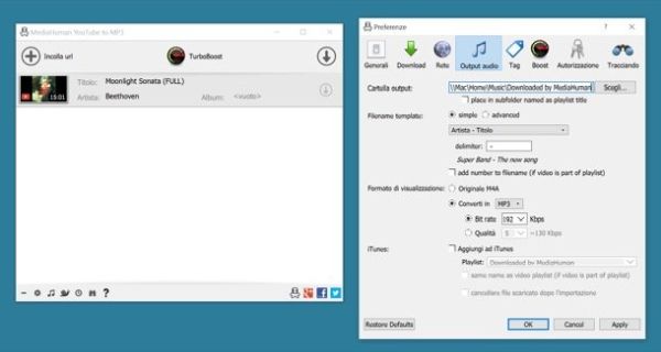 MediaHuman YouTube to MP3 Converter è un altro ottimo software per convertire i video di YouTube in MP3, OGG o M4A con un bitrate massimo di 320kbps. È completamente gratuito ma include un servizio in abbonamento, denominato TurboBoost, che consente di ottenere canzoni da YouTube senza doverne scaricare prima tutto il video (quindi più velocemente). Costa 9,99$ all'anno.
