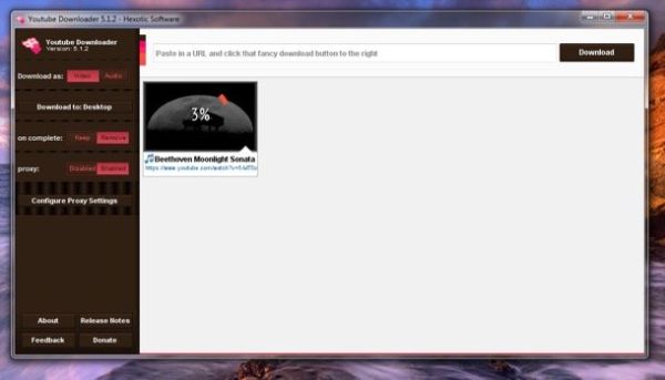 Ad installazione completata, avvia YouTube Downloader, posiziona il cursore del mouse nell'angolo sinistro della finestra e attiva l'opzione Audio nella barra che compare sulla sinistra. Dopodiché incolla l'indirizzo del video da cui intendi estrapolare la traccia audio nel campo di testo che si trova in alto, pigia sul pulsante Download e attendi che il download giunga al termine. Otterrai un MP3 di discreta qualità.