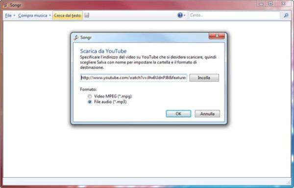 Per effettuare il download di brani presenti su YouTube, avvia Songr e seleziona la voce Scarica da YouTube dal menu File. Nella finestra che si apre, metti il segno di spunta accanto alla voce File audio (*.mp3), incolla l'indirizzo del video di YouTube che vuoi scaricare sotto forma di mp3 nel campo di testo collocato al centro della finestra e fai click su OK per avviare lo scaricamento. La qualità dei brani ottenuti è di 192 kbps.
