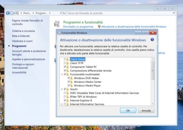 Tutto quello che devi fare è aprire Pannello di controllo (richiamandolo dal menu Start o cercandolo nella barra degli indirizzi dell'Esplora Risorse), cliccare sull'icona Programmi collocata in basso a sinistra e selezionare l'opzione Attiva o disattiva funzionalità di Windows dalla schermata che comprare. Se non vedi l'icona Programmi nel pannello di controllo cerca direttamente la voce relativa all'attivazione e alla disattivazione delle funzionalità di Windows tramite la barra di ricerca collocata in alto a destra.