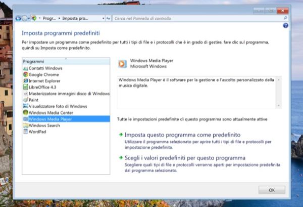 Per ripristinare l'associazione di WMP con i principali formati di file multimediali su Windows 7 e 8 devi recarti in Pannello di controllo, cercare il termine predefiniti