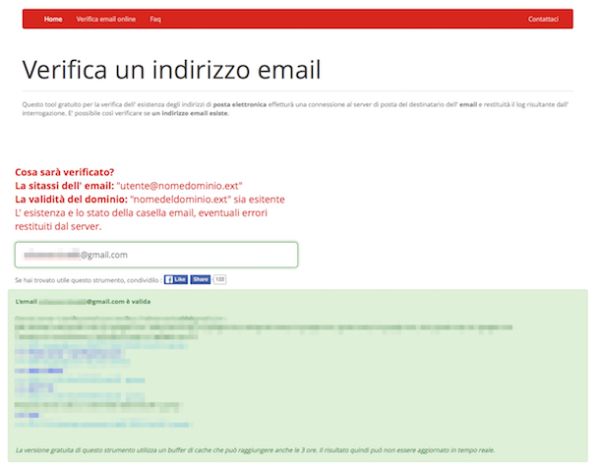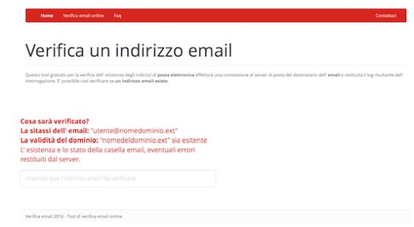 A questo punto, potresti finalmente aver individuato l'indirizzo email giusto della persona che stai cercando ma... come fare a verificarne l'effettiva esistenza? Semplice, servendoti del sito Internet Verifica Email. Si tratta di un sito Web che, così come suggerisce lo stesso nome, consente di verificare la validità degli indirizzi di posta elettronica. Ovviamente tieni presente che non ti verrà mostrato nome e cognome dell'effettivo proprietario dell'indirizzo di posta digitato ma ti verrà indicato solo e soltanto se la mail inserita è realmente esistente ed attiva oppure no.