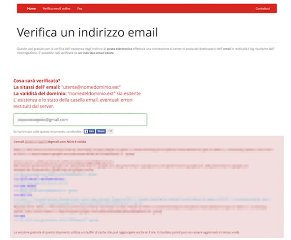 Se invece il risultato del test effettuato mediante il sito Internet Verifica Email risulta negativo ti verrà mostrato a schermo un riquadro di colore rosso indicante il fatto che l'indirizzo di posta elettronica da te precedentemente digitato non è valido.