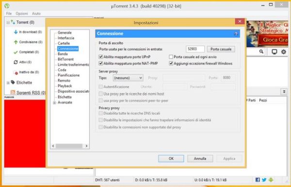 Per scoprire qual è la porta utilizzata da uTorrent per accogliere le connessione in entrata, segui questa semplicissima procedura.