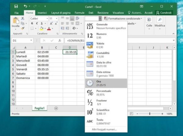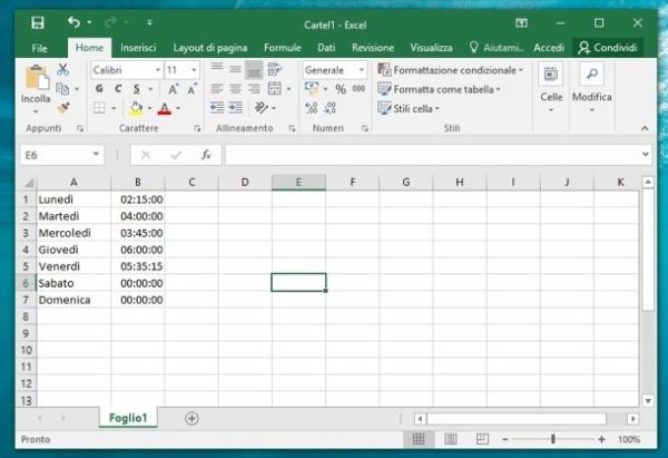 Facendo un esempio pratico, puoi creare una tabella in cui nelle celle che vanno da A1 ed A7 ci sono elencati i giorni della settimana (es. Lunedì, Martedì, ecc.) e in quelle che vanno da B1 a B7 il numero di ore, minuti e secondi che hai speso per compiere il lavoro di cui vuoi realizzare un resoconto.