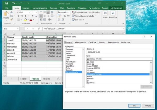 Nella finestra che si apre, seleziona la voce Personalizzato dalla barra laterale di sinistra e indica nel campo di testo Tipo la formattazione che hai deciso di adottare per gli orari di inizio e fine del lavoro. Nel mio esempio io ho usato gg/mm/aa hh:mm, che equivale a una data e un orario come 08/08/16 12:00.