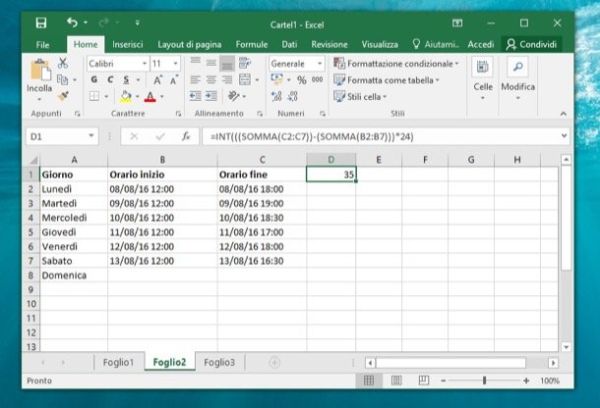 Successivamente, portati nella cella in cui desideri visualizzare il numero totale di ore che hai lavorato e digita il seguente codice =INT(((SOMMA(C2:C7))-(SOMMA(B2:B7)))*24) dove al posto di C2:C7 e B2:B7 devi inserire le coordinate relative alle celle in cui hai elencato gli orari di inizio e fine del lavoro.