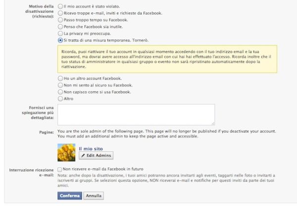 Metti quindi il segno di spunta accanto ad una delle opzioni disponibili (es. Si tratta di una misura temporanea. Tornerò) e clicca sul pulsante Conferma, dopodiché digita la password del tuo account Facebook nel riquadro che compare e fai click su Disattivare ora. Infine, digita il codice di conferma (captcha) che ti viene proposto e clicca sul pulsante Invia per completare l'operazione.