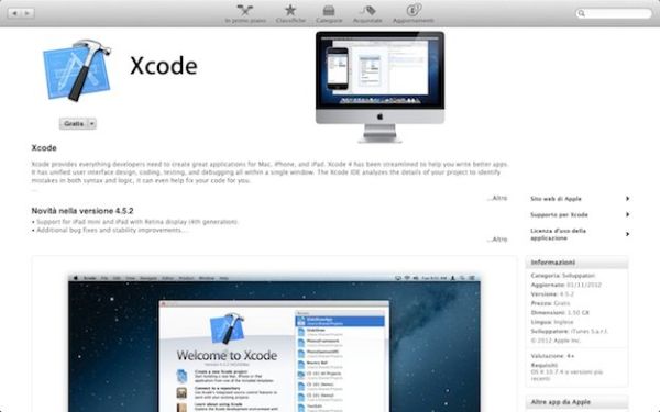 Una volta effettuata l'iscrizione al programma di sviluppatori per iOS, devi aprire il Mac App Store e scaricare Xcode (clicca qui per il link diretto), il software attraverso il quale è possibile realizzare app per iOS avendo a disposizione un editor grafico, un editor di codice e diversi modelli preimpostati che consentono di prendere confidenza con l'ambiente di sviluppo. Insieme ad Xcode installati anche l'iOS software development kit (SDK) e l'iPhone Simulator, un emulatore di iPhone che ti permetterà di eseguire un primo test sulle app sviluppate senza usare un vero “melafonino”.
