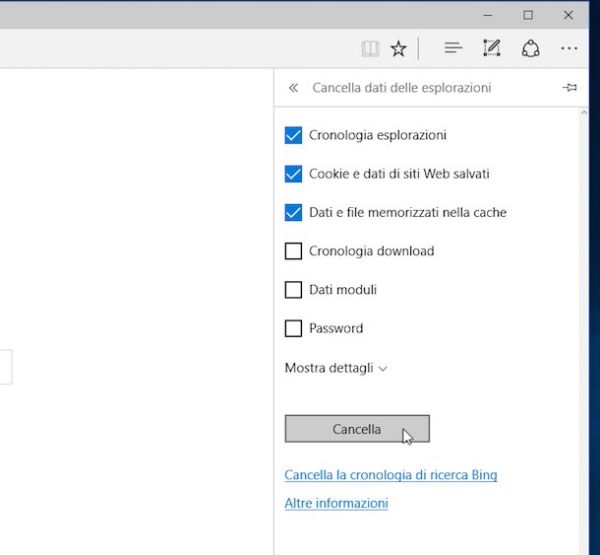 Nella finestra che si apre, espandi il menu Dettagli pigiando sul pulsante raffigurante una freccia e accertati che ci sia il segno di spunta accanto alla voce Cache dopodiché fai clic sul bottone Cancella adesso per completare l'operazione. Se non desideri eliminare anche la cronologia e gli altri dati di navigazione prima di fare clic su Cancella adesso rimuovi i segni di spunta presenti accanto alle altre voci selezionate di default.