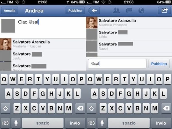 A questo punto, puoi avviare Facebook sul tuo “melafonino” e cominciare a taggare i tuoi amici proprio come fai sul computer. Basta infatti digitare il simbolo @ (chiocciolina) seguito dalle iniziali del nome della persona da taggare e, in maniera del tutto automatica, compare un menu dal quale selezionare l'amico da menzionare nel post.
