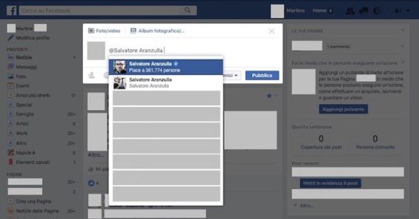 Ti interessa capire come fare per taggare su Facebook in un post? Allora le prime cose che devi fare dopo aver effettuato l'accesso al social network sono quella di cliccare nel riquadro con scritto all'interno A cosa stai pensando? che trovi collocato nella parte alta della sezione principale del social network, digitare il simbolo @ (lo stesso che utilizzi per gli indirizzi di posta elettronica!) ed inserire il nome dell'amico che è tua intenzione menzionare (ad esempio @salvatore aranzulla).