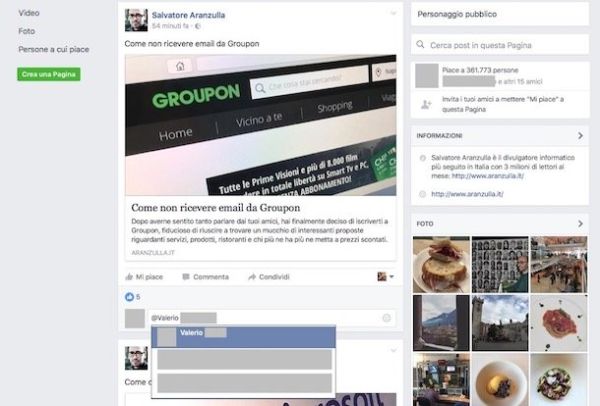 Per inserire correttamente i nomi delle persone da taggare nei tuoi post puoi aiutarti con il menu di completamento automatico che compare quando si digita il simbolo @ nel riquadro per l'aggiornamento dello stato. Anche in tal caso, in un singolo post puoi taggare più utenti per volta ma per ciascuno di essi dovrai effettuare la procedura che ti ho appena indicato.
