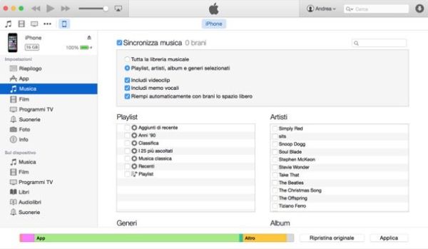 Se non vuoi sincronizzare tutta la libreria di iTunes ma solo i brani degli artisti che preferisci o le playlist che desideri, metti il segno di spunta accanto alla voce Playlist, artisti, album e generi selezionati. Dopodiché utilizza i riquadri Playlist, Artisti, Generi e Album per selezionare gli elementi da sincronizzare con l'iPhone e clicca sul pulsante Applica (collocato in basso a destra) per avviare il trasferimento degli elementi multimediali selezionati sullo smartphone.