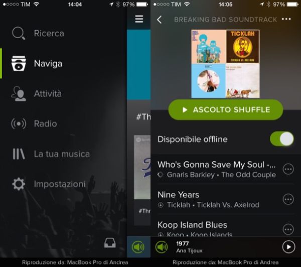Tutto quello che devi fare è creare una playlist contenente tutti i brani che vuoi ascoltare offline sul tuo "melafonino" (dal PC o dallo stesso smartphone, è uguale), recarti nella sezione La tua musica > Playlist della app di Spotify per iPhone e attivare l'opzione Disponibile offline nella playlist che hai creato in precedenza.