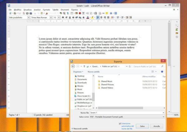 Nella finestra che si apre, scegli la cartella in cui salvare il documento, imposta l'opzione PDF dal menu a tendina Salva come e clicca sul pulsante Salva per avviare l'esportazione del file.