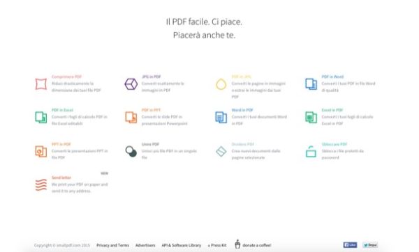 Per utilizzarlo, collegati alla sua pagina iniziale e scegli il tipo di conversione che desideri effettuare: JPG in PDF per ottenere un documento partendo da una serie di immagini; Word in PDF per trasformare file DOC/DOCX in PDF; Excel in PDF per creare PDF partendo da fogli di Excel o PPT in PDF per convertire presentazioni di PowerPoint in PDF.
