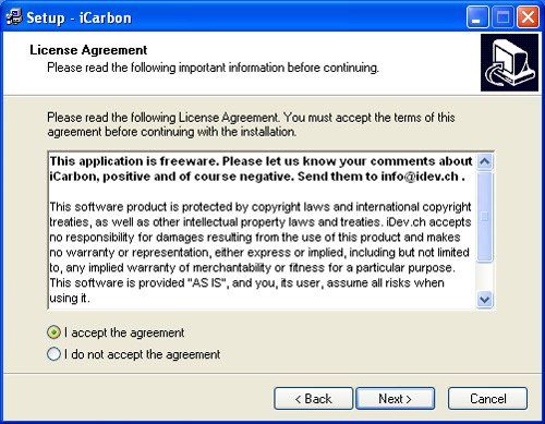 Collegati sul sito Internet di iCarbon e fai click sulla voce Download iCarbon 2 per scaricare il programma. Dopo averlo scaricato, fai doppio click su di esso e, nella prima finestra, fai semplicemente click su Next.