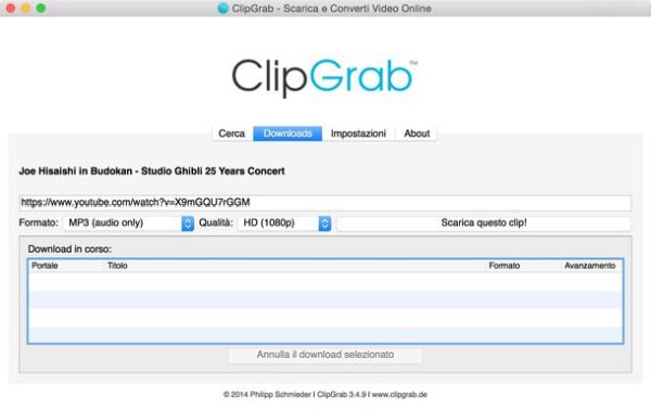 Passando alle soluzioni offline, ma comunque rimanendo nell'ambito di strumenti estremamente intuitivi e semplici da usare, ti consiglio ClipGrab. Si tratta di un software gratuito per Windows e Mac OS X che permette di scaricare i video da YouTube ed estrapolarne la traccia audio in formato MP3 oppure OGG.