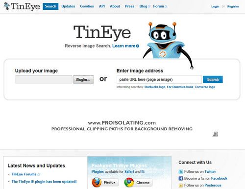 Se sei alla ricerca di una soluzione per trovare foto e immagini simili, non puoi che rivolgerti a TinEye. Si tratta di un motore di ricerca specializzato che permette di trovare immagini uguali o simili tra loro partendo da un file caricato dal PC o dall'indirizzo di una foto già presente su Internet.