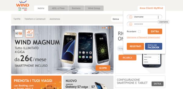 Per fare ciò collegati innanzitutto a Wind.it facendo clic qui. Una volta visualizzata la pagina Web del sito Internet di Wind porta il cursore del mouse sulla voce Area personale collocata in alto a destra ed immetti i dati di login relativi al tuo account Wind completato i campi destinati all'username e alla password dopodiché pigia sul bottone Entra. Se non disponi dei dati di accesso all'area personale del sito di Wind perché ancora non ti sei registrato puoi rimediare facilmente pigiando sul pulsante arancione Registrati ed attenendoti poi alla semplice procedura guidata che ti viene mostrata a schermo oppure facendo clic sul pulsante blu Entra con Faceook avendo poi cura di fornire i dati facenti riferimento al tuo account su Facebook.