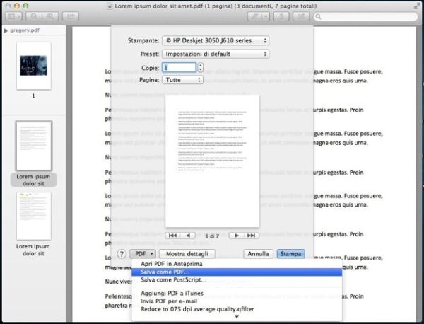 Ad operazione completata, richiama il comando di stampa selezionando l'apposita voce dal menu File e, nella finestra che si apre, seleziona la voce Salva come PDF dal menu a tendina PDF collocato in basso a sinistra. Scegli dunque la cartella in cui salvare il documento, digita il nome che vuoi assegnargli nell'apposito campo di testo e clicca sul pulsante Salva per creare il tuo PDF "unito".