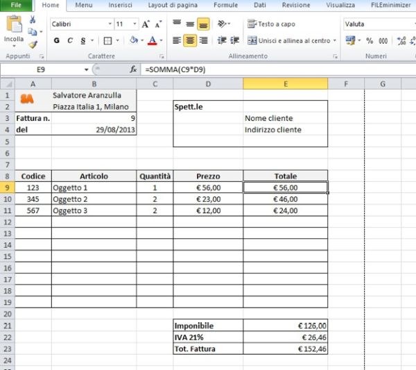Va da sé che il totale fattura sia dato dalla somma dell'imponibile e dell'IVA, che si può ottenere facilmente adoperando la formula =SOMMA(E21+E22), dove al posto di E21 ed E22 vanno inserite le coordinate delle celle con imponibile ed IVA.