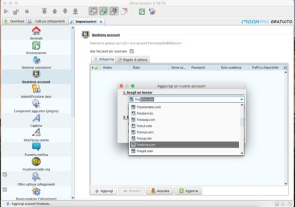 Se sei titolare di un account Premium per uno qualsiasi dei cyberlocker supportati da JDownloader, puoi bypassare conto alla rovescia e captcha e scaricare sempre alla massima velocità aggiungendo il tuo account alle impostazioni del programma.