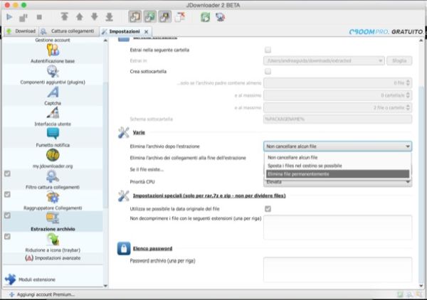 Se non hai molto spazio a disposizione sul disco del tuo Mac, puoi anche fare in modo che dopo l'estrazione dei file che contiene l'archivio venga cancellato. Per attivare questa funzione, recati nelle preferenze di JDownloader, seleziona la voce Estrazione archivio dalla barra laterale di sinistra e imposta su Elimina file permanentemente il menu a tendina Elimina l'archivio dopo l'estrazione.
