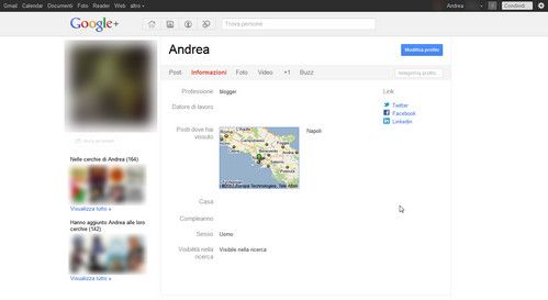 Cliccando sul tuo nome presente nella parte destra della barra nera, potrai anche modificare il tuo profilo. Nella pagina del profilo di Google+ si trovano i post scritti sul social network (Post), le proprie informazioni personali (Informazioni), le proprie foto, i propri video, i messaggi pubblicati su Google Buzz (Buzz) e i collegamenti alle pagine o agli articoli dei blog che si sono segnalati cliccando sul pulsante +1 di Google.