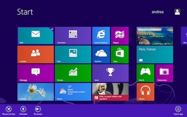 È inoltre possibile rimuovere i tile dalla Start Screen, facendo click destro su questi ultimi e selezionando la voce Rimuovi da Start dal menu che compare in basso, e visualizzare un elenco “classico” di tutte le applicazioni installate sul PC cliccando con il tasto destro del mouse in un punto “vuoto” della schermata Start (in cui non ci sono tasselli) e selezionando la voce Tutte le app che compare in basso a destra. Per disattivare le animazioni dei tasselli dinamici, bisogna invece fare click destro su questi ultimi e selezionare la voce Disattiva riquadro animato dal menu che viene visualizzato in basso.