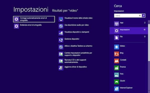 Per effettuare una ricerca con Windows 8, basta infatti recarsi nella Start Screen (premendo il tasto Win della tastiera o cliccando nell'angolo basso a sinistra dello schermo, se ci si trova sul Desktop) e cominciare a digitare i termini da cercare. Si apre automaticamente una pagina con sulla sinistra tutti i risultati della ricerca e sulla destra l'elenco di tutte le aree in cui è possibile cercare dati e informazioni: App per cercare le applicazioni, Impostazioni per cercare gli elementi del pannello del controllo, File per cercare documenti e di seguito tutte le app che consentono la ricerca di contenuti al loro interno.