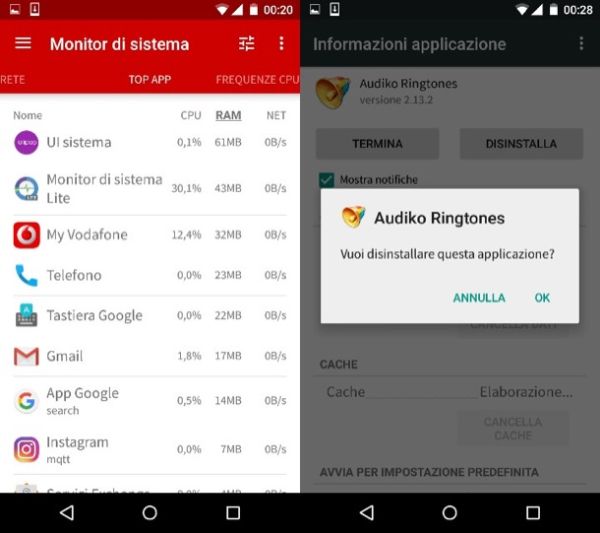 Se fra le app più “pesanti” ce ne sono alcune di cui non hai bisogno, selezionale dall'elenco e rimuovile dal tuo smartphone/tablet pigiando prima sul bottone Disinstalla e poi su OK. Mi raccomando però, non provare a rimuovere le applicazioni di sistema (es. Google Play Services, Location Services, UI sistema ecc.) o potresti compromettere seriamente la stabilità di Android. Le applicazioni di sistema sono quelle che hanno come icona la faccia del robottino verde e/o sono collegate ai servizi di Google, le puoi riconoscere abbastanza facilmente.