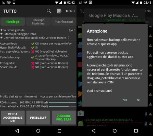 Mi raccomando, cancella solo applicazioni che sei sicuro di poter cancellare e non rimuovere i componenti essenziali di Android (ne abbiamo parlato anche prima). Inoltre, prima di procedere, ricordati di effettuare un backup delle app da cancellare, puoi fare tutto con Titanium Backup.