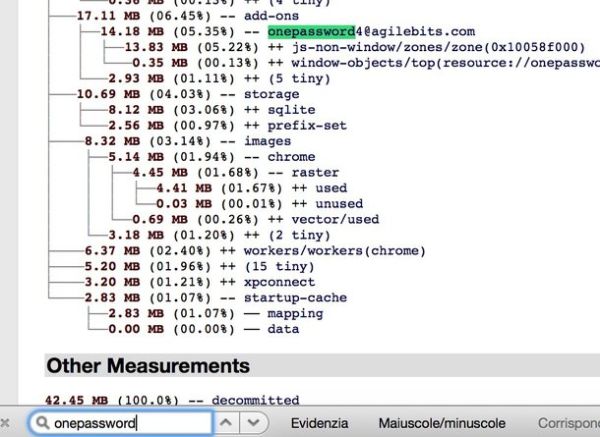 Per scoprire il consumo di memoria di uno specifico add-on, richiama la funzione di ricerca rapida premendo Ctrl+F sulla tastiera del computer (cmd+f se hai un Mac) e digita il nome dell'estensione da esaminare nel riquadro che compare in basso a sinistra: troverai il quantitativo di RAM occupato dall'add-on prima del suo nome. Maggiori info qui.