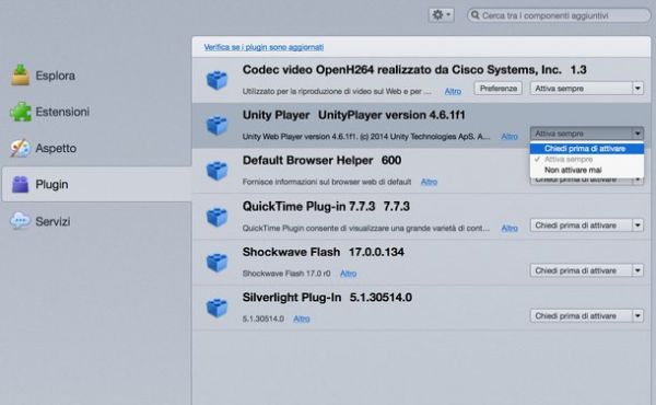 Nella scheda che si apre, seleziona la voce Plugin dalla barra laterale di sinistra, clicca sul pulsante Attiva sempre collocato accanto al nome di Shockwave Flash, Silverlight Plug-in e degli altri componenti per i quali intendi bloccare l'esecuzione automatica e imposta l'opzione Chiedi prima di attivare dal menu che compare.