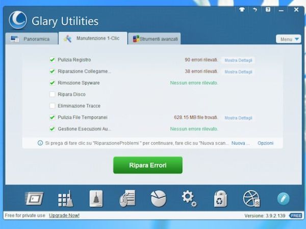 Nella finestra che si apre, seleziona la scheda Manutenzione 1-Clic e fai click sul pulsante Ricerca errori per avviare la scansione del computer e lasciare che Glary Utilities individui tutti i problemi che rallentano il sistema (file inutili sull'hard disk, errori nel registro, ecc.). Ad operazione completata (ci vorranno pochi minuti), clicca sul pulsante Ripara errori e il software correggerà tutti i problemi rilevati.