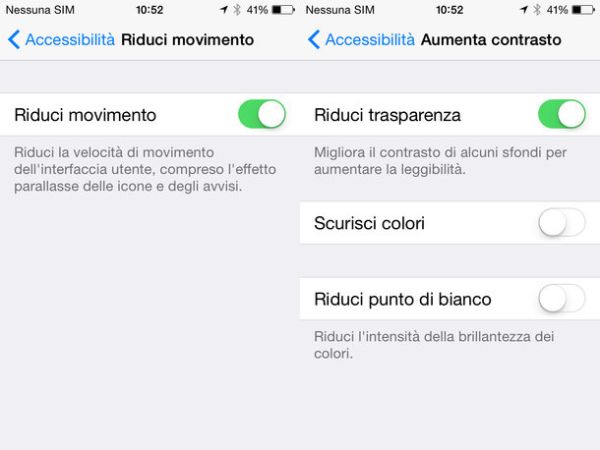 A questo punto, vai su Aumenta contrasto e attiva la funzione Riduci trasparenza per disattivare in un sol colpo tutti gli effetti di trasparenza di iOS: quelli della barra Dock, quelli del centro notifiche e così via. Ad operazione completata, spostati nel menu Riduci movimento, attiva la funzione Riduci movimento e disattiverai anche tutte le animazioni superflue di iOS: quelle per il passaggio da una schermata all'altra, quelle per la comparsa delle icone in home screen ecc., le quali verranno sostituite da un brevissimo effetto di dissolvenza.