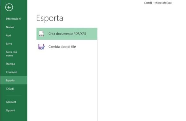 Se utilizzi Office 2010 o 2013 devi aprire il documento di Excel da convertire, dopodiché devi cliccare sul pulsante File che si trova in alto a sinistra e selezionare la voce Esporta > Crea documento PDF/XPS dal menu che si apre. Assicurati dunque che nel menu a tendina situato in fondo alla finestra sia selezionata l'opzione PDF e completa l'esportazione del documento scegliendo il nome da assegnare a quest'ultimo e la cartella in cui salvarlo.