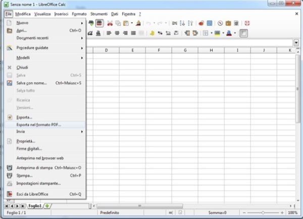 Una volta completata la procedura d'installazione di LibreOffice, per trasformare un file di Excel in un file PDF con Calc (l'applicazione per i fogli di calcolo) non devi far altro che cliccare sul menu File e selezionare la voce Esporta nel formato PDF da quest'ultimo.