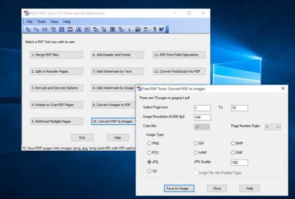 Per convertire PDF in JPG offline, invece, ti consiglio di utilizzare PDFill FREE PDF Tools. Come suggerisce il nome, si tratta di un'applicazione all-in-one per lavorare con i file PDF sotto Windows. Consente di unire e dividere documenti, applicare watermark, convertire le pagine dei documenti in immagini e molto altro ancora. È completamente gratuita ed è molto semplice da utilizzare.