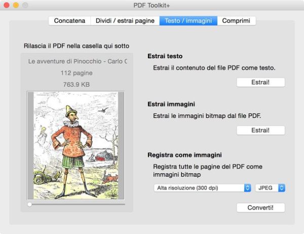 Utilizzi un Mac? Allora sappi che puoi convertire PDF in JPG facilmente con PDF Toolkit+. Si tratta di una piccola app che mi piace definire come un "coltellino svizzero" per i PDF: permette di unirli, dividerli, comprimerli, convertirli ed estrarre testi e immagini da essi. La puoi scaricare dal Mac App Store al prezzo di 1,99 euro.