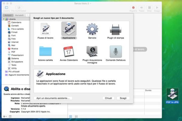 La procedura da seguire è abbastanza semplice. Avvia Automator (lo puoi trovare nella cartella Altro del Launchpad), scegli di avviare la creazione di una nuova Applicazione e seleziona la voce Libreria dalla barra laterale di sinistra.