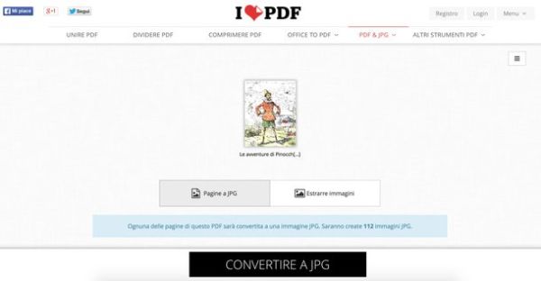 Per utilizzarlo, collegati alla sua pagina iniziale e trascina il PDF da convertire nella finestra del browser. Dopodiché scegli se convertire le pagine a JPG o se estrarre immagini dal PDF e pigia sul bottone Convertire a JPG per avviare l'elaborazione - e il conseguente download - delle immagini.