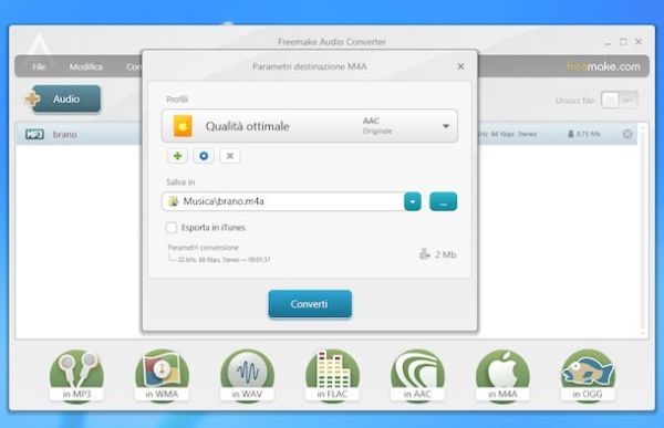 Per trasformare un file audio con Freemake Audio Converter, clicca sul pulsante +Audio collocato in alto a sinistra e scegli i brani da convertire. Successivamente, clicca sul pulsante relativo al formato in cui desideri convertire il file (es. MP3, AAC, OGG), seleziona la qualità del file di output da generare dall'apposito menu a tendina e clicca sul pulsante Converti per avviare la conversione.