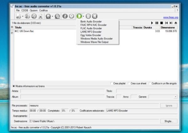 Adesso, trascina i brani che desideri convertire nella finestra del programma, dopodiché clicca sulla freccia collocata accanto al simbolo play (nella barra degli strumenti di Fre:ac) e seleziona il formato in cui desideri trasformare i file. Puoi scegliere fra: MP3 (Lame MP3 Encoder), FLAC (FLAC Audio Encoder), WMA (Windows Media Audio Encoder), OGG (Ogg Vorbis Encoder) e altri formati ancora.