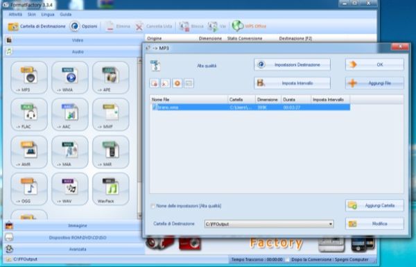 Un altro convertitore musica per Windows che puoi prendere in considerazione è FormatFactory. In realtà non si tratta di un software dedicato esclusivamente alla musica, bensì di un convertitore multimediale in grado di lavorare anche con video e immagini. Ad ogni modo svolge il suo lavoro con i file audio in maniera egregia assicurando una facilità di utilizzo quasi spiazzante. Supporta i file MP3, WMA, FLAC, APE, AAC, WAV, OGG e non solo.