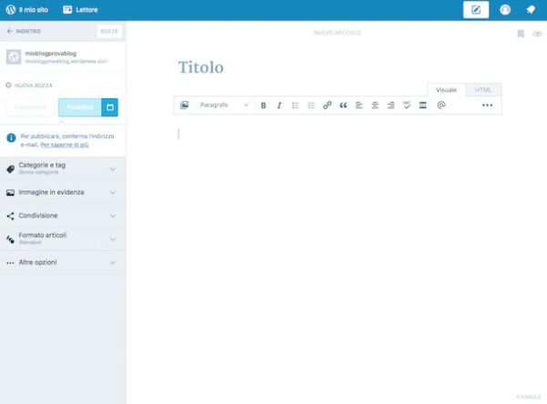 In seguito, clicca sul bottone Seleziona piano gratuito e compila il modulo che ti viene proposto digitando il tuo indirizzo email, il nome utente e la password che intendi usare per l'accesso al servizio. Per finire, fai clic sul bottone Crea blog e poi su quello Continua per accedere immediatamente al tuo blog appena creato. Appena hai un minuto di tempo, non dimenticare di confermare il tuo indirizzo di posta elettronica che hai scelto di associare al servizio facendo clic sul link presente nella mail che il team di WordPress ha provveduto ad inviarti.
