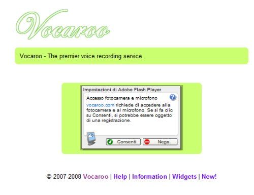 Per registrare il messaggio vocale, collegati sul sito Internet di Vocaroo e fai click sul pulsante Click to record. Viene mostrata la richiesta di Adobe Flash Player di utilizzare il nostro microfono per registrare il messaggio vocale: fai click sul pulsante Consenti per autorizzare Adobe Flash Player. Perfetto, puoi iniziare a parlare.